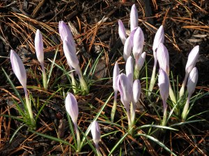 Blooming crocus! The fountain has bubbled for a week. (It was unplugged for the winter.)