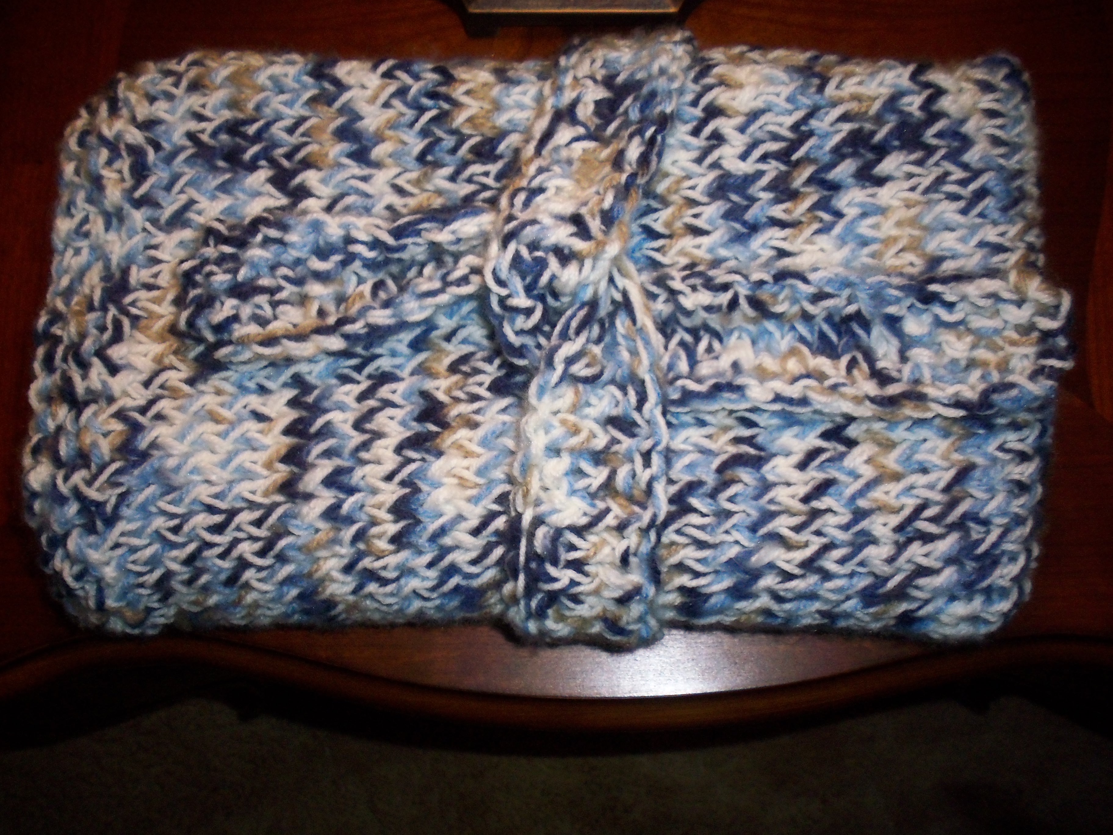 This blanket is knitted with technique new to me, two strands simultaneously. Yes, the tie for this blanket is the result of my first attempt knitting the blanket. My salvaged “do over” is just the right dimension to make a tie.