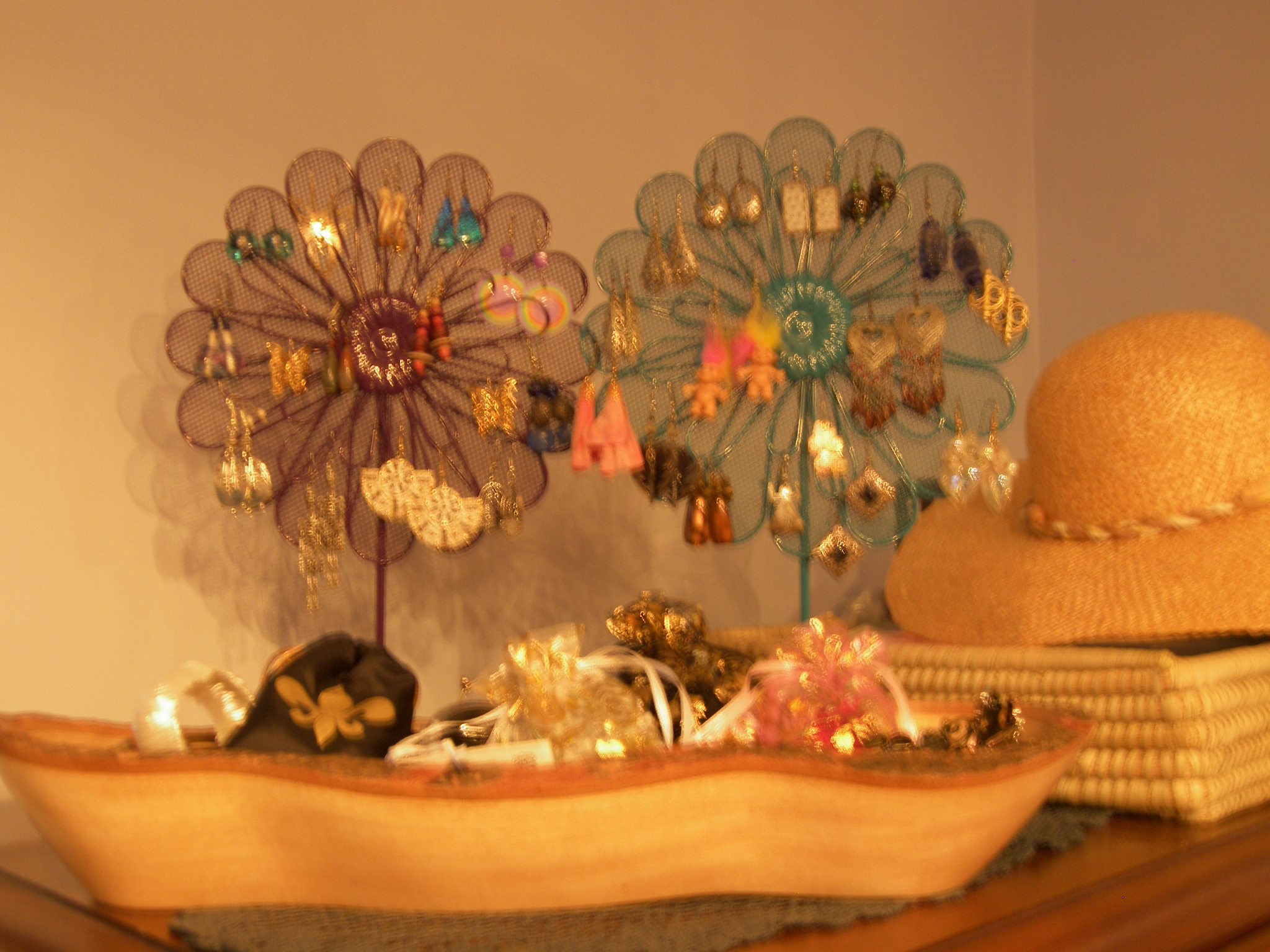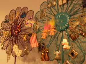 These earring holder/displays remind me of “Flower Power” from the comedy variety show “Laugh In” broadcast in the early 1970s. It was a thrill to find them on sale at Bed Bath and Beyond yesterday. For years, I displayed earrings on lace stretched over an embroidery hoop….very easy to retrieve. More recently each pair was stored in its own “cube” of an ice-cube tray.