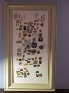 What to do with those enamel pins that are collections, gifts, awards, remembrances, etc? For years, like my earrings, I used and embroidery hoop with fabric stretched for pinning. Some of these pins in my collection are rather heavy (especially the Disney ones). Last year it occurred to me that stretched canvas would be sturdier. The custom frame finishes my “story board”, “Pinterest”, other suggestions for a name?