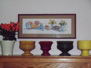 My pairing for the top of the bookcase features 1960s circa flower pots from my in-laws garage and an original Mary Ann Boysen “kitchen window” series painting. Accessorizing my still life painting with the vintage pots adds the third dimension and bold colors.