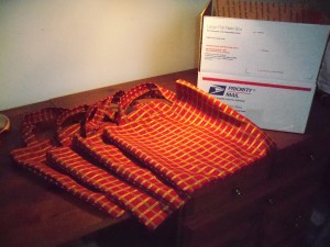 Four red, green and gold tote bags shipped today with 16 dresses to South Africa to join other donations for Helping Hands Touching Hearts. Sidney, Wayne and CJ are flying this weekend from Detroit to South Africa to personally distribute clothing, mosquito netting, tote bags and shoes. Their journey is beautifully documented on this site: http://web.me.com/clotheavillage/Site/Welcome.html