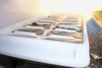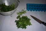 I am inspired by the idea of herbs chopped and frozen in ice-cube trays. Last weekend, I froze a tray of basil. Today, two trays of parsley. Filling each cube with a tablespoon of herbs, it takes about two cups for a full tray.