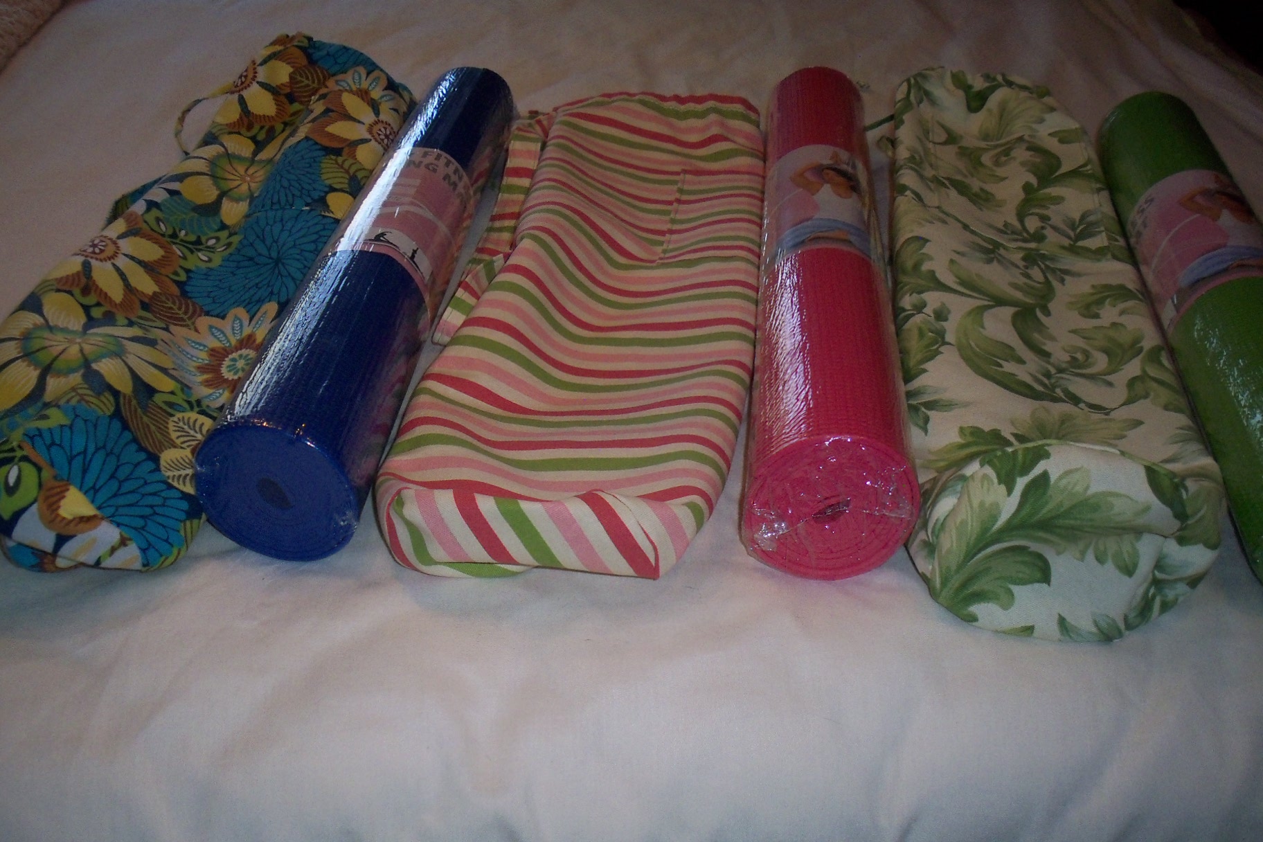 I purchased several boxes of yoga mats left unsold from a holiday marketing promotion. That would be a total of 65. The mats come in bold blue, green, purple, pink and gray. 18 got custom bags and found good homes. Leaving 47 in the closet. (7 will stay in my stash for the time being.) 40 mats now have matching bags to be donated to a local women’s shelter.