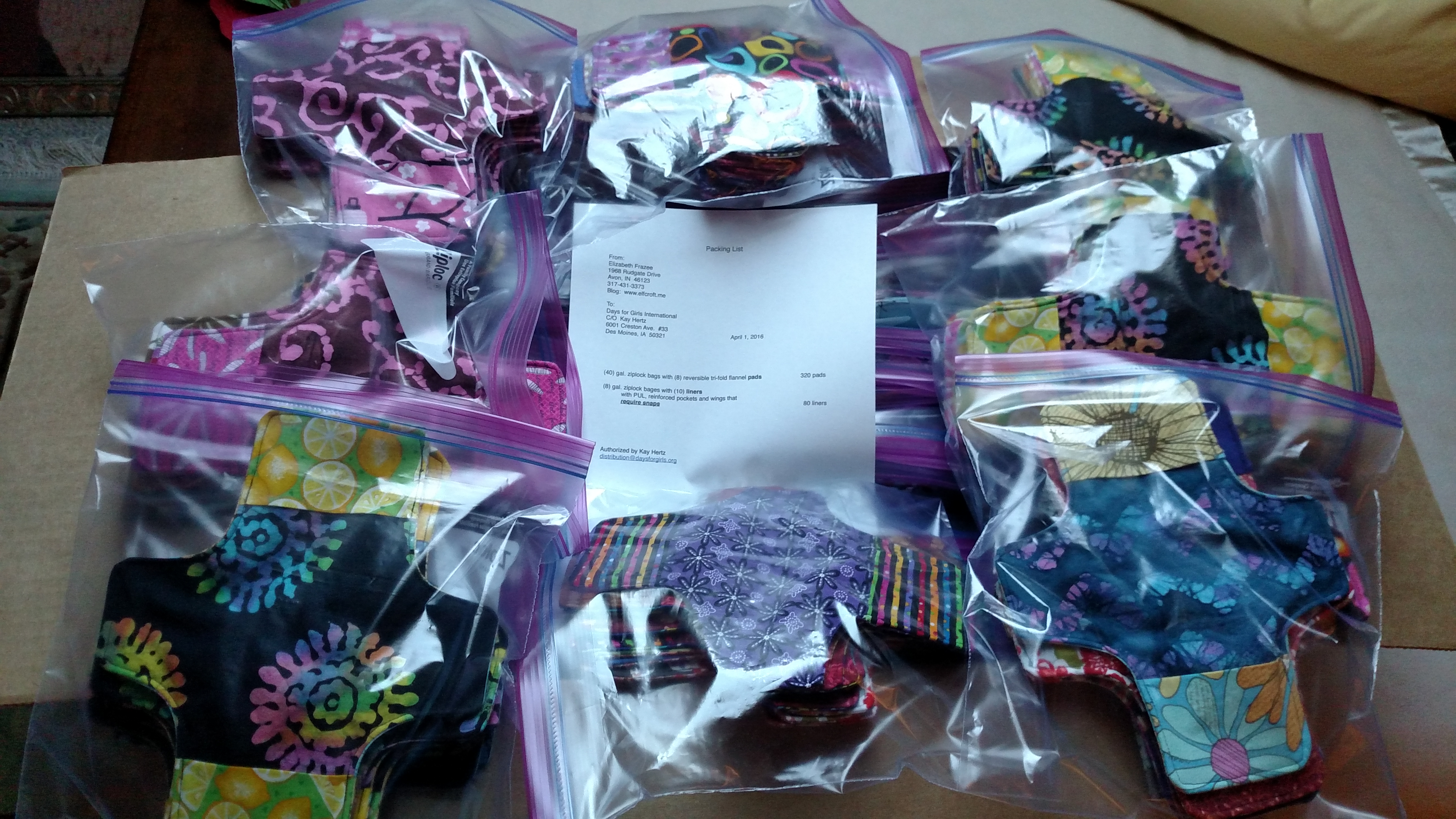 Shipping 80 liners and 320 flannel pads to Days for Girls International