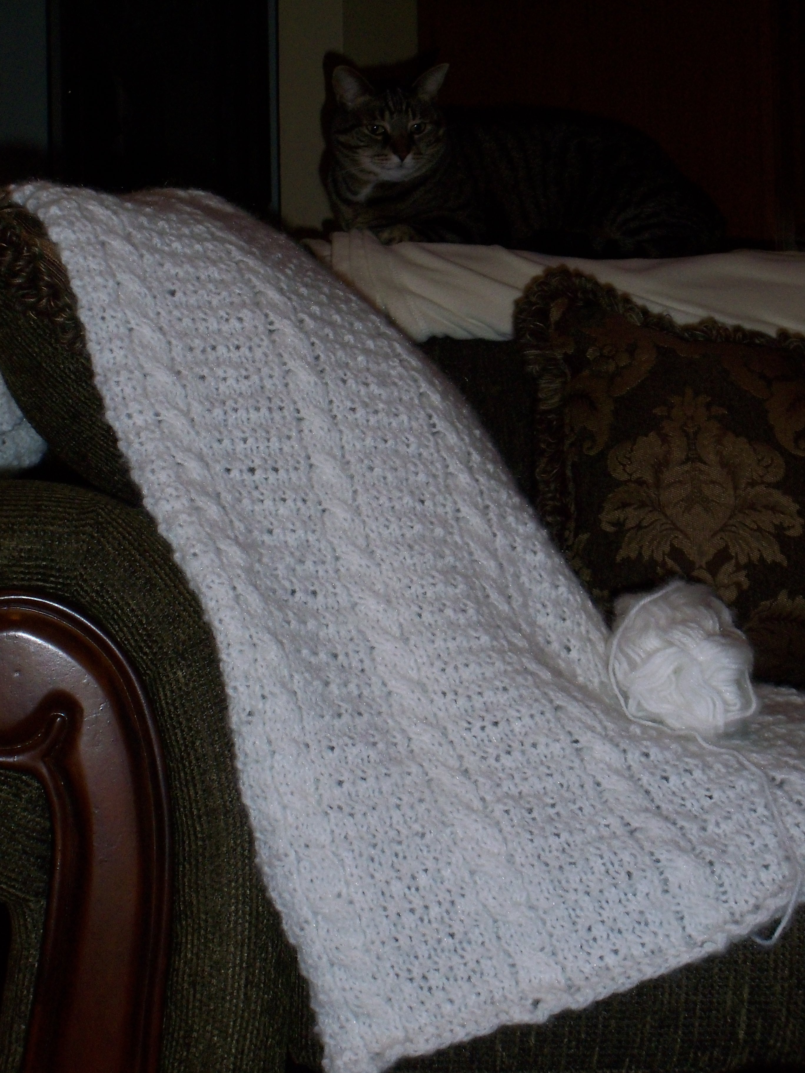 Our fifth one is a new pattern for us. We moved up to intermediate skill level. This is a first with the cable pattern. It is made of a lamb’s wool blend with shimmer. The color is “White Frost”. The pattern features the number 12 with repeating rows and tassels.