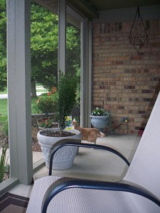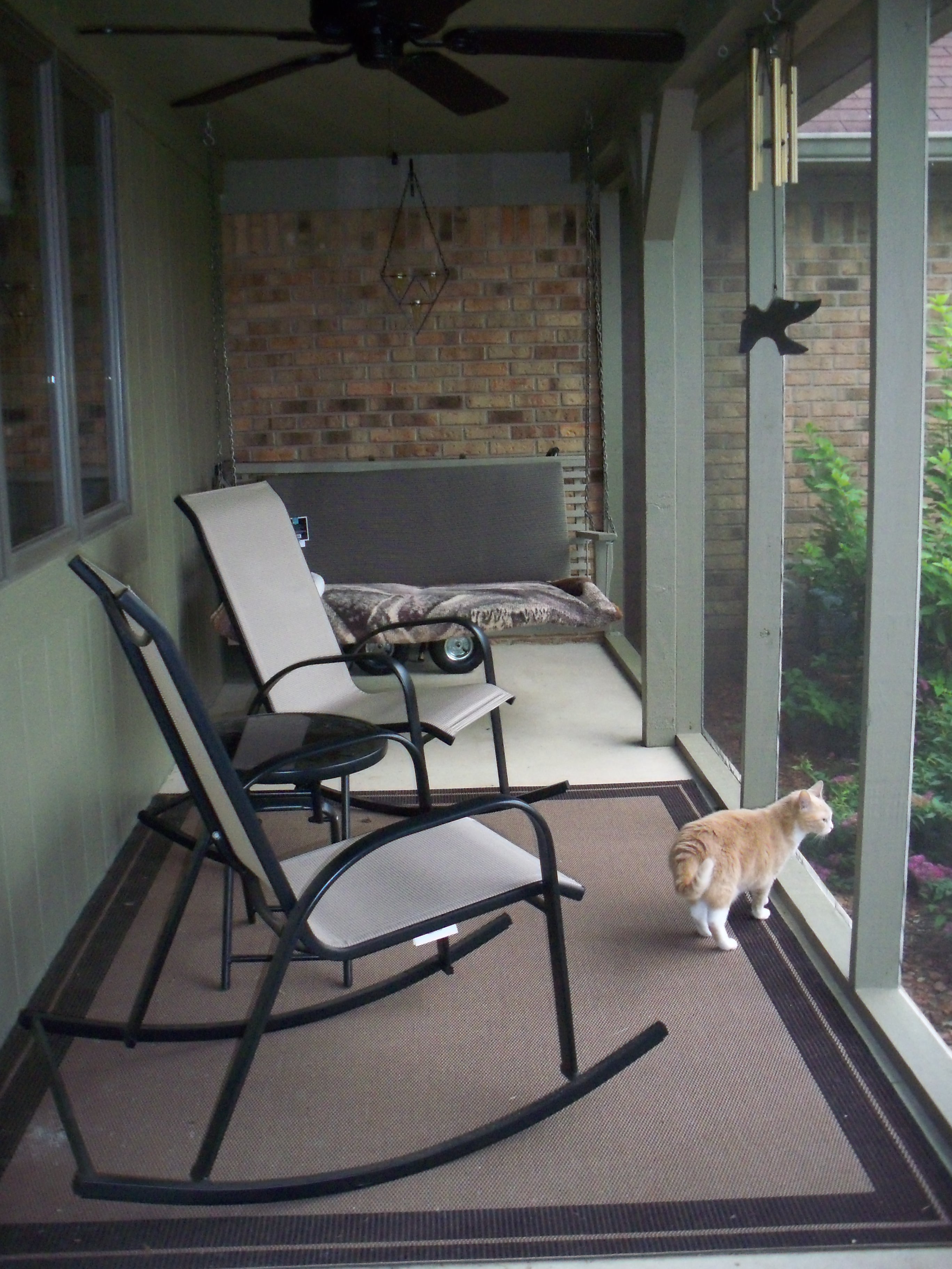 25 JunThe screen is new. Why didn’t we do this years ago? (The foundation plantings were over grown.) Could we say “tricked out” with ceiling fan, new rocking chairs plus table, “candle”labra, wind chime and the porch swing Pap-pa Hall made over 25 years ago. It is delightful to watch Shelby relate to all the sights and sounds of the outdoors. He stays on high alert.