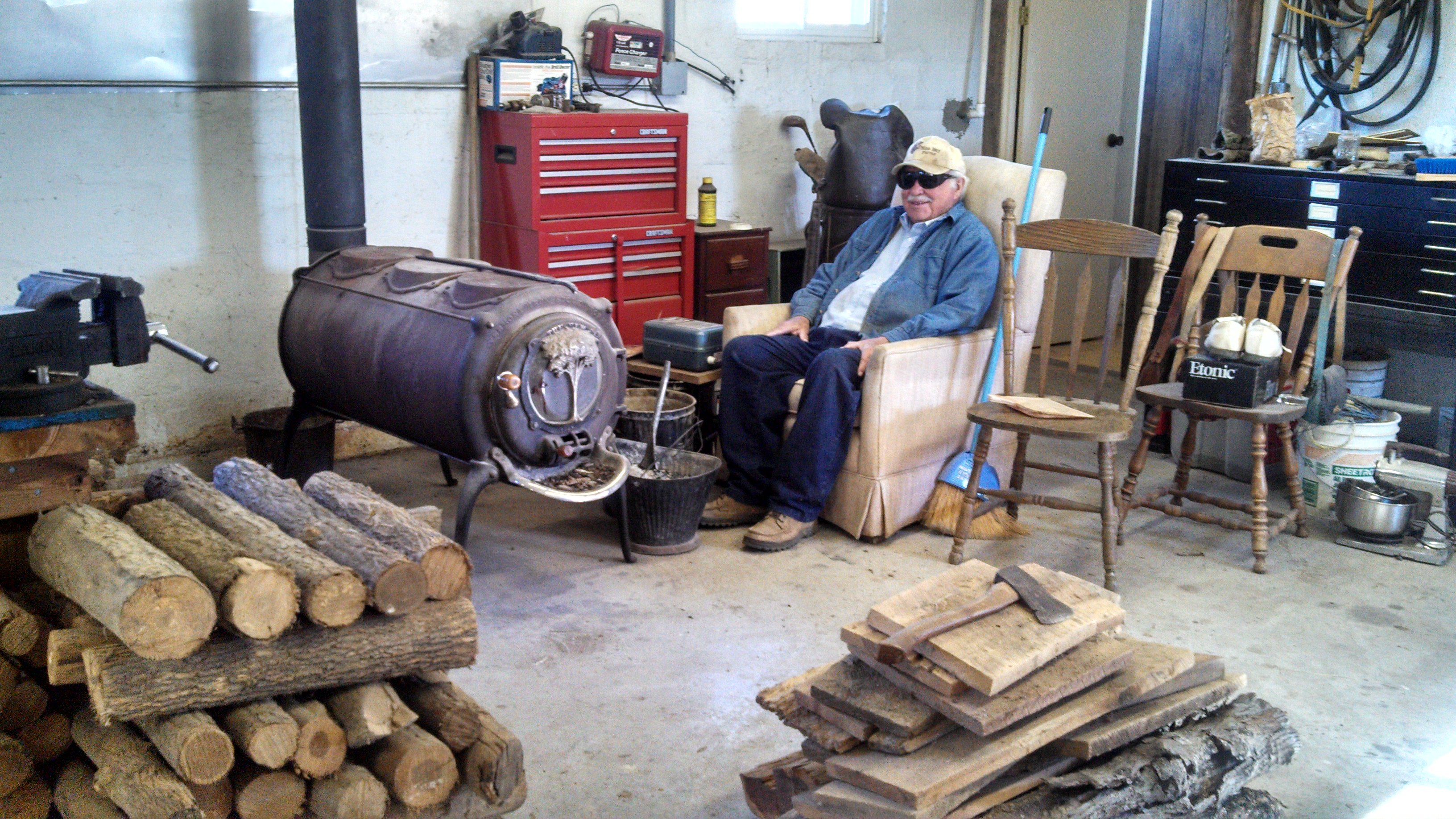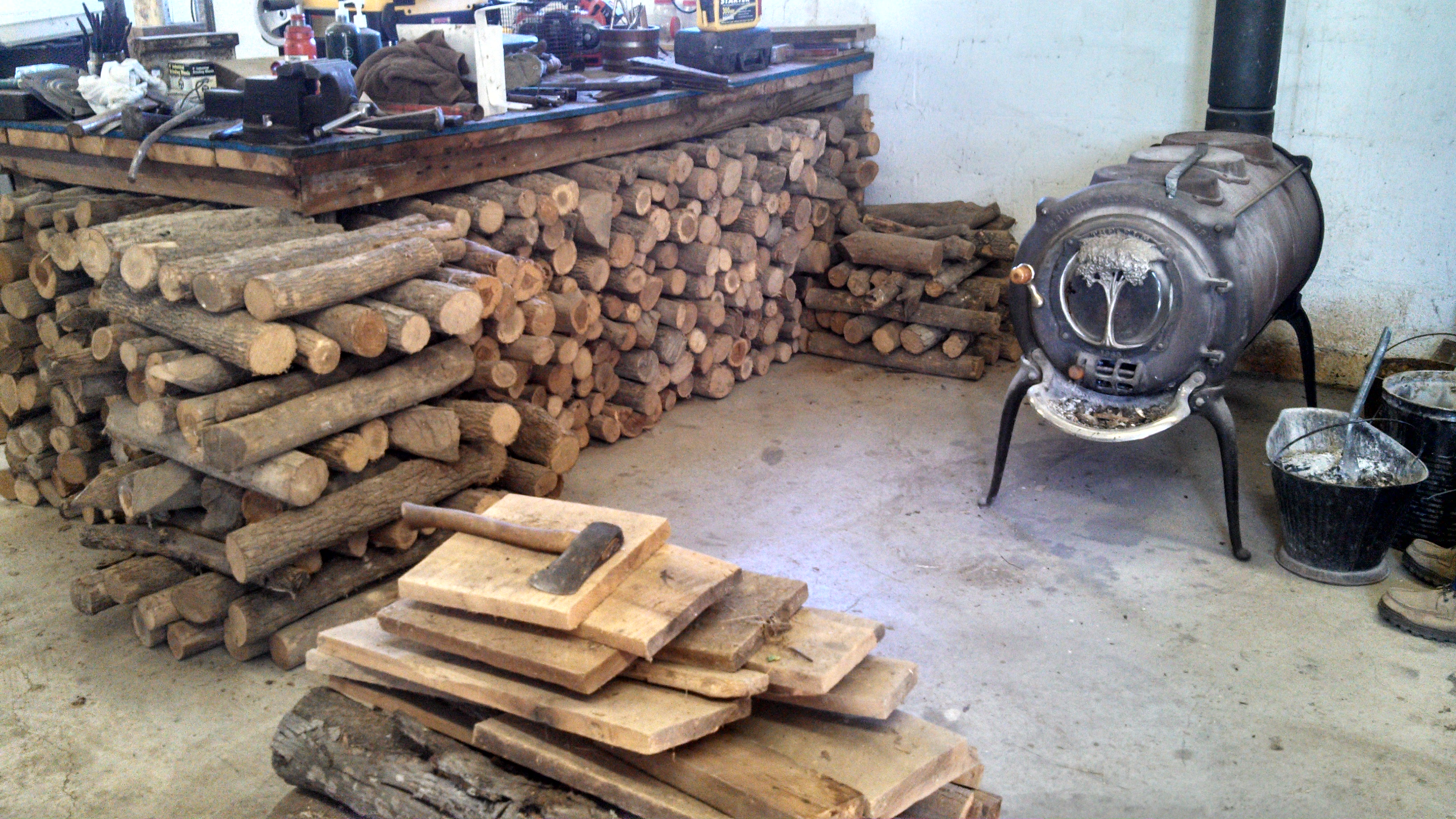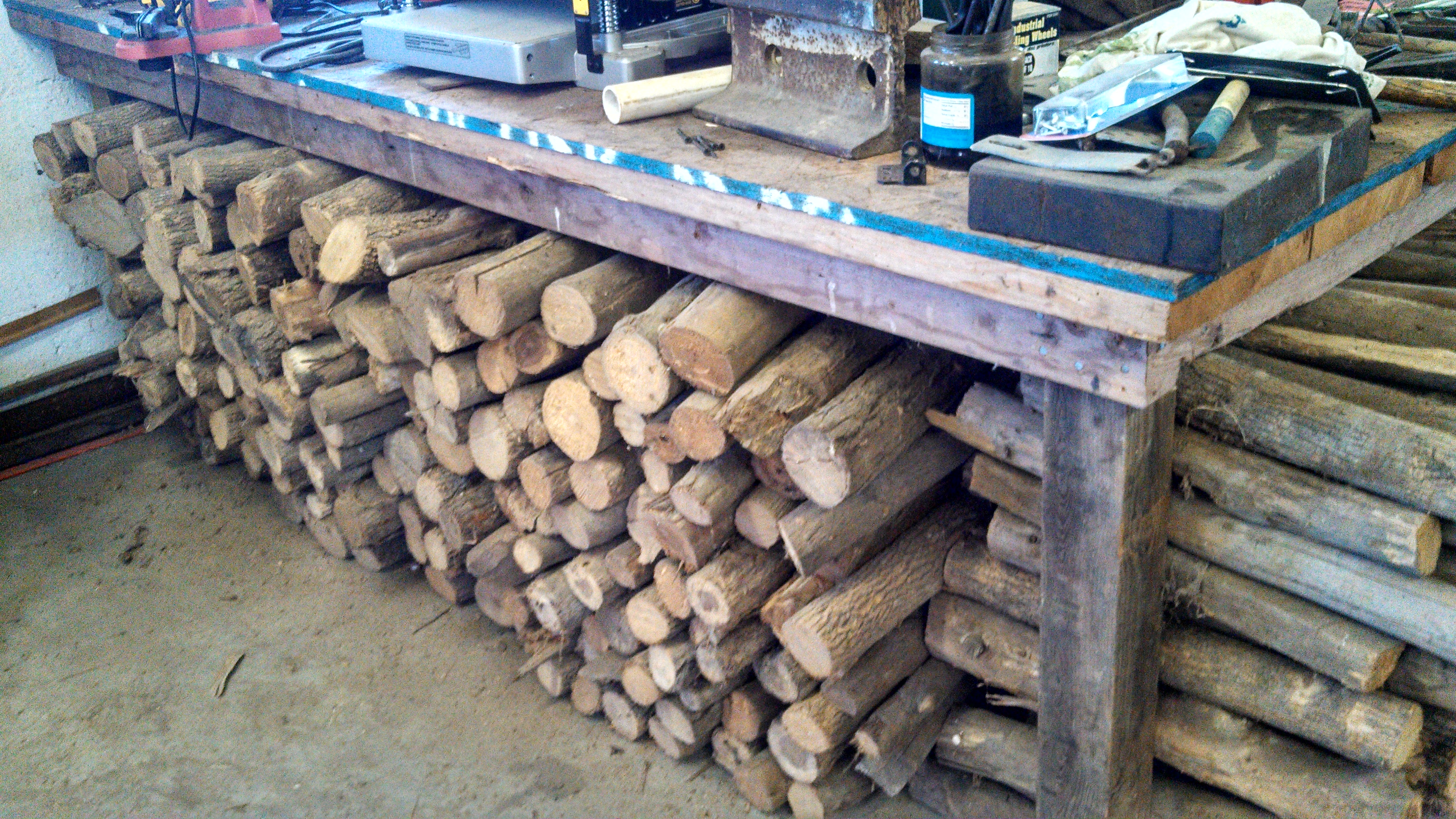Dad is ready for next winter with wood at point of use, stowed under a 4′ x 8′ workbench.  Yes, there was an overflow.  Fun estimates:  density of this wood=30#/cu.ft and 100 cu. ft of storage makes for 3000#s or 1.5 tons!  That concludes the story of my alternative workout.