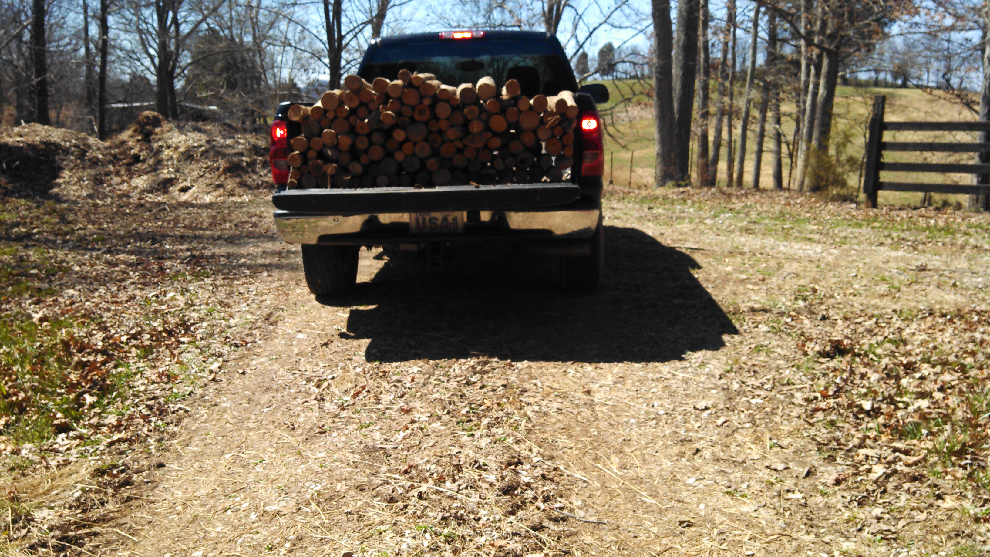 This stack was originally small, long, straight trees used for poles to hang tobacco plants to dry.  (The hay barn was originally a tobacco barn.)  Long out of use, the poles were cut into firewood.  The problem is this is about a quarter-mile from where it would ultimately be used.  Now, this is where my alternative workout comes in.