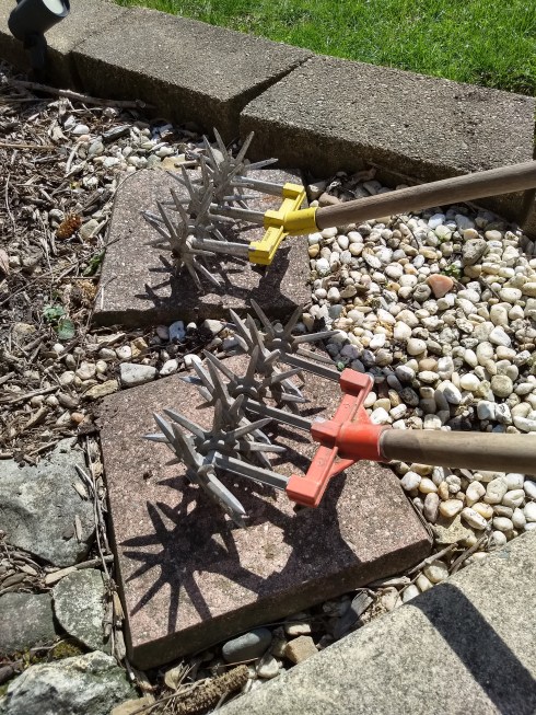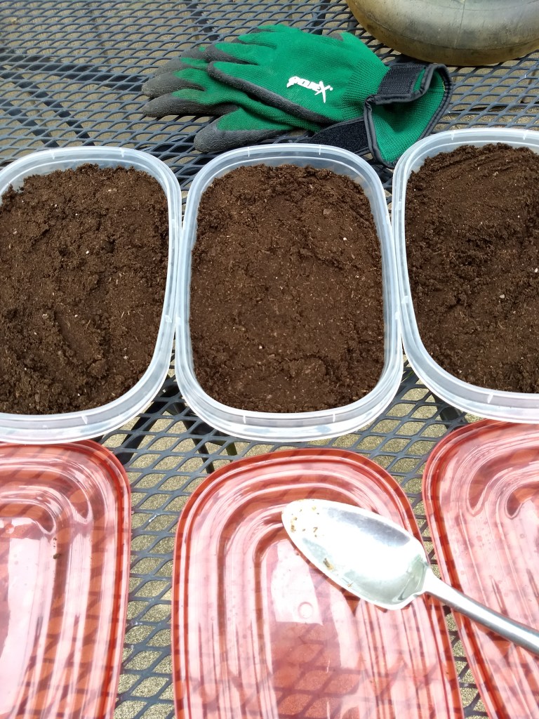 Responding to the loss oak seedlings ruined by squirrels going for the meat of the acorn…I have turned the table! Using a small cage to keep wild life out and protect future tree…rather than keep animals IN. 45 acorns in peat pots.