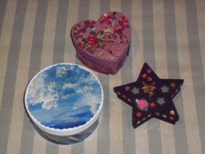 29 Jan“God boxes” used to hold written prayers, an action symbolizing turning the concern over to God and literally putting a lid on them. Developed by Liza Hyatt in workshops at her “Heart of Art” Studio. Three different themes shown in this photo are mountain tops, puzzle pieces and stars.