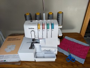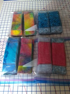 I have volunteered since 2014. After some months, I chose to concentrate on making the reversible trifold flannel pads and the top stitched shields with pockets, wings and PUL (polyurethane laminate). (The drawstring bags, seen in most DfGI photos, make the 11th sewn item for each kit.) Volunteer’s choice!