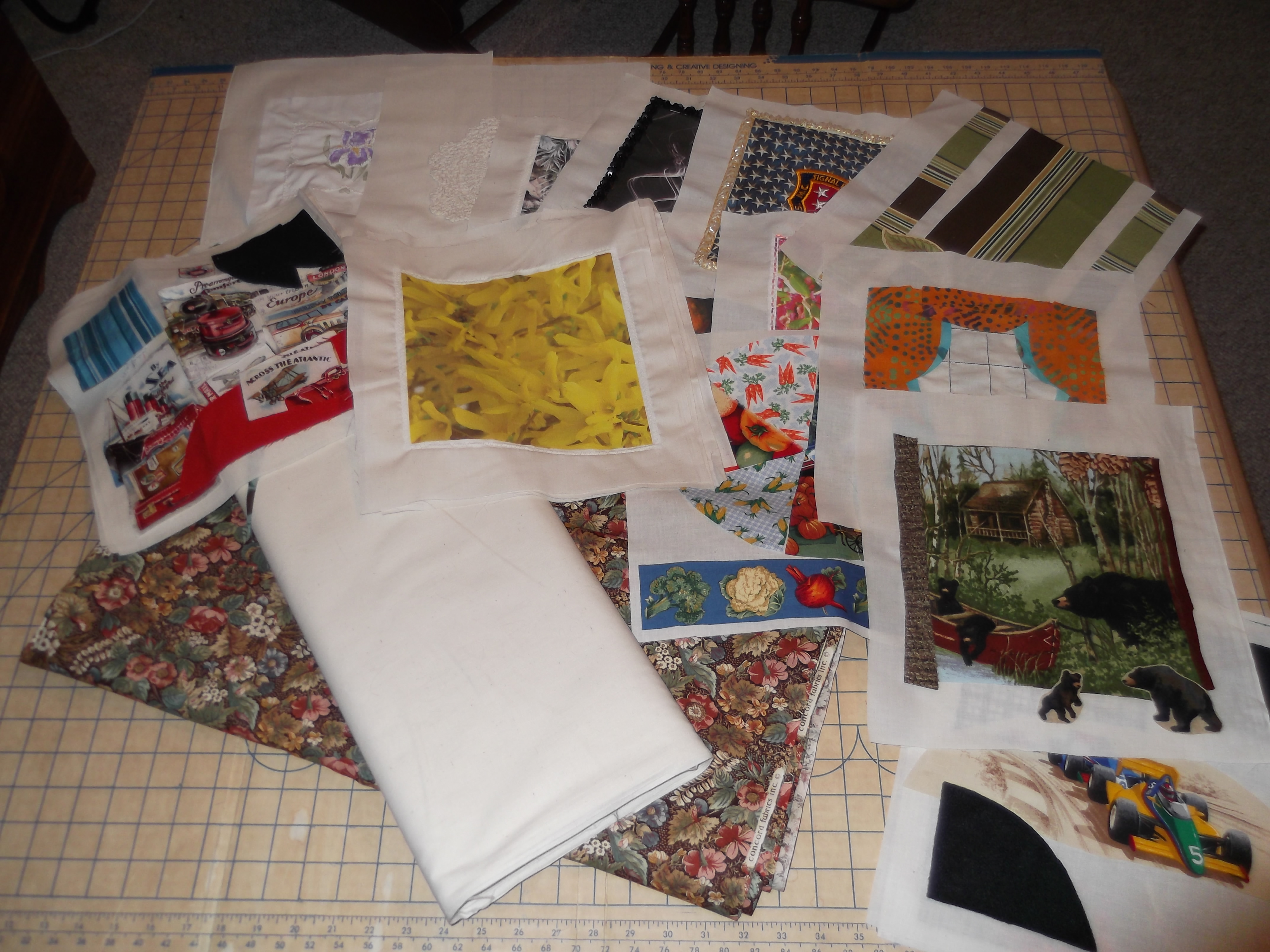 This post features another evolving project inspired by an e-book Art Journal Ideas by ClothPaperScissors.com which includes a chapter by Tracie Lyn Huskcamp @ thereddoor-studio.com titled “A Year Captured in Fabric”. What I have so far are 11″X12″ pieces of muslin with themed collages from remnants and fabric photos from Spoonflower.com. This is a great opportunity to prepare custom “quilt squares” that do not have to stand washing and wear. A few unfinished projects are getting closure and inclusion in the “journal”. Beads, buttons and trim are embellishing layouts. I have 11 squares completed and 11 squares with concepts. My intended scope is 48 squares which will finish the bolt of muslin that Mam-ma Tuggle left with her sewing accessories.