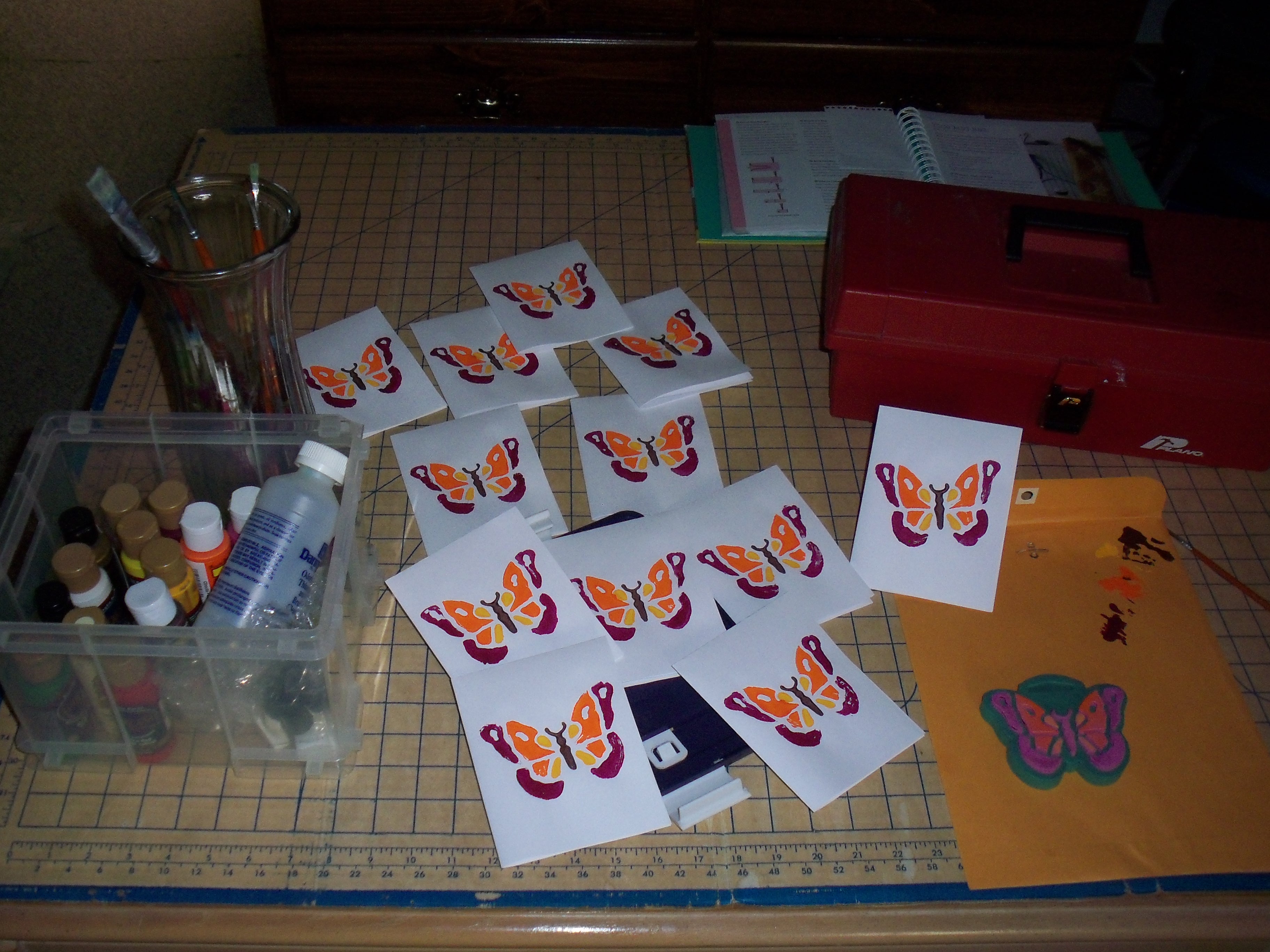 Needing a change from making dozens of cards online with digital photos over the years…..I dug deep. I found a foam butterfly stamp and paints that were still good in my stash. About an hour later, I had a dozen butterfly folded cards the old-fashioned way….and free!