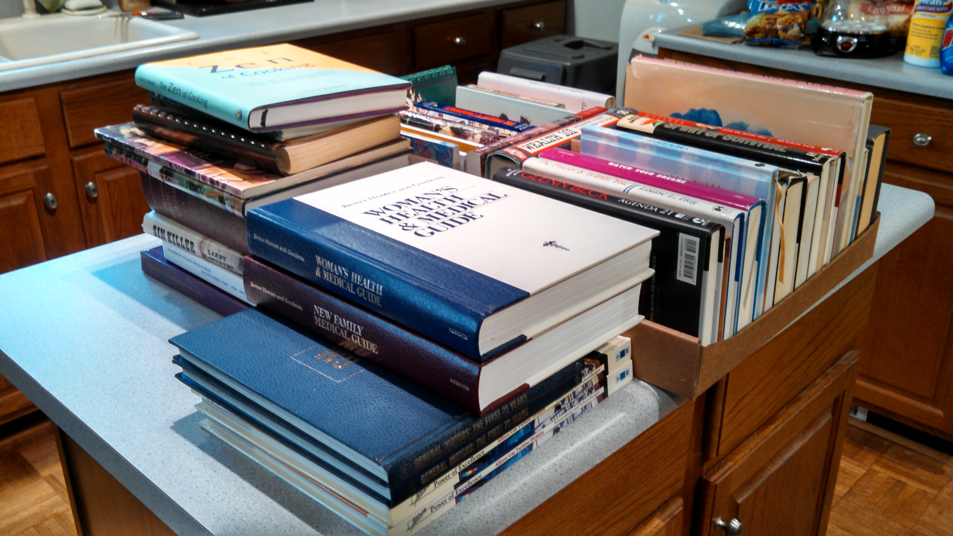 I put away the recipe for Impossible Vegetable Pie. Pause. Ah ha. Half of my modest cookbook collection is just taking up counter space. Now those unused cookbooks are headed to a public library book sale. But not before…I’m on a roll…before scrutinizing the nine shelves behind the couch. In 2010, the nine shelf solution was progress. Some of the books I have had 50 years. The thermodynamics text book…40 years. Blah, blah, blah. Since then, I have read dozens of ibooks.