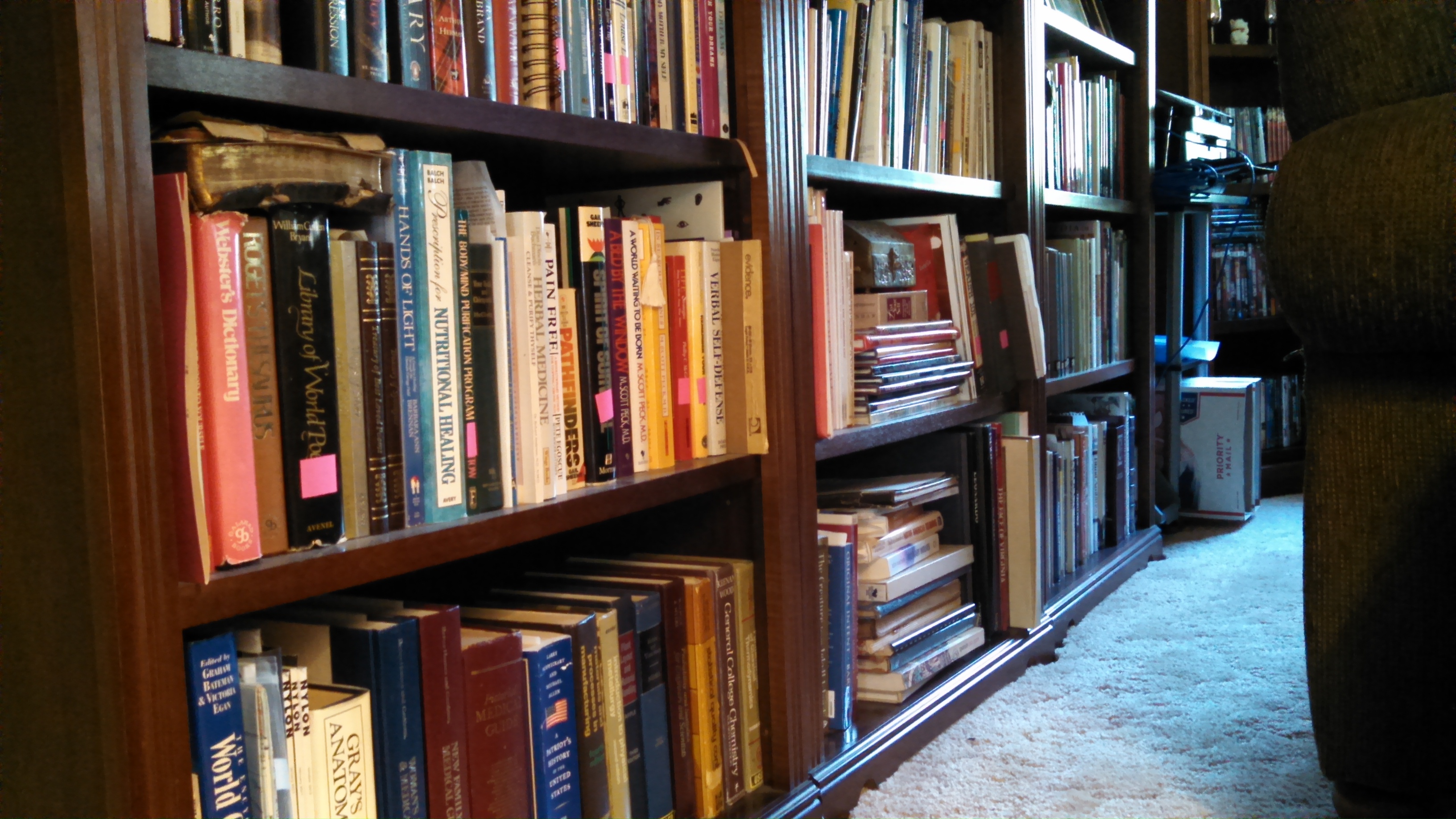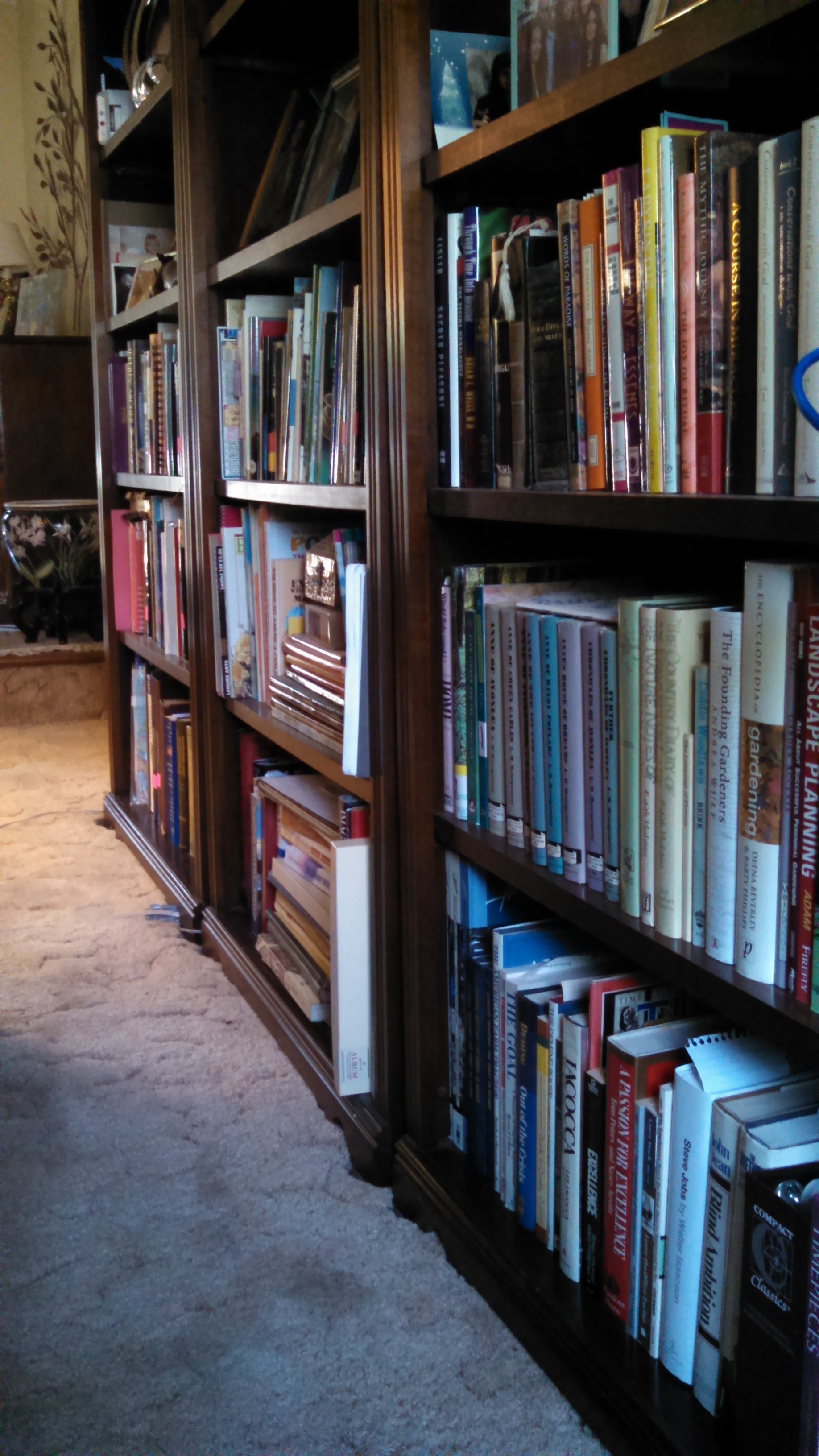 The first sort of about 300 books is complete with everything left in place and hot pink stickers on spines of books to donate. The subjects range from travel, gardening, fiction, non-fiction, business…even organizing…I stopped to scan that one. The goal of the 2010 effort was to fill the shelves to keep “Office Assistant” Eve from napping between books. There is no Dewey decimal system in place.