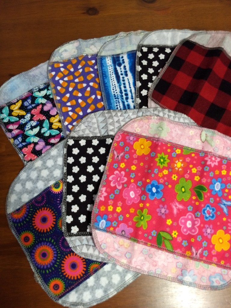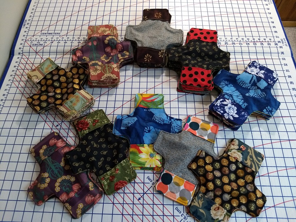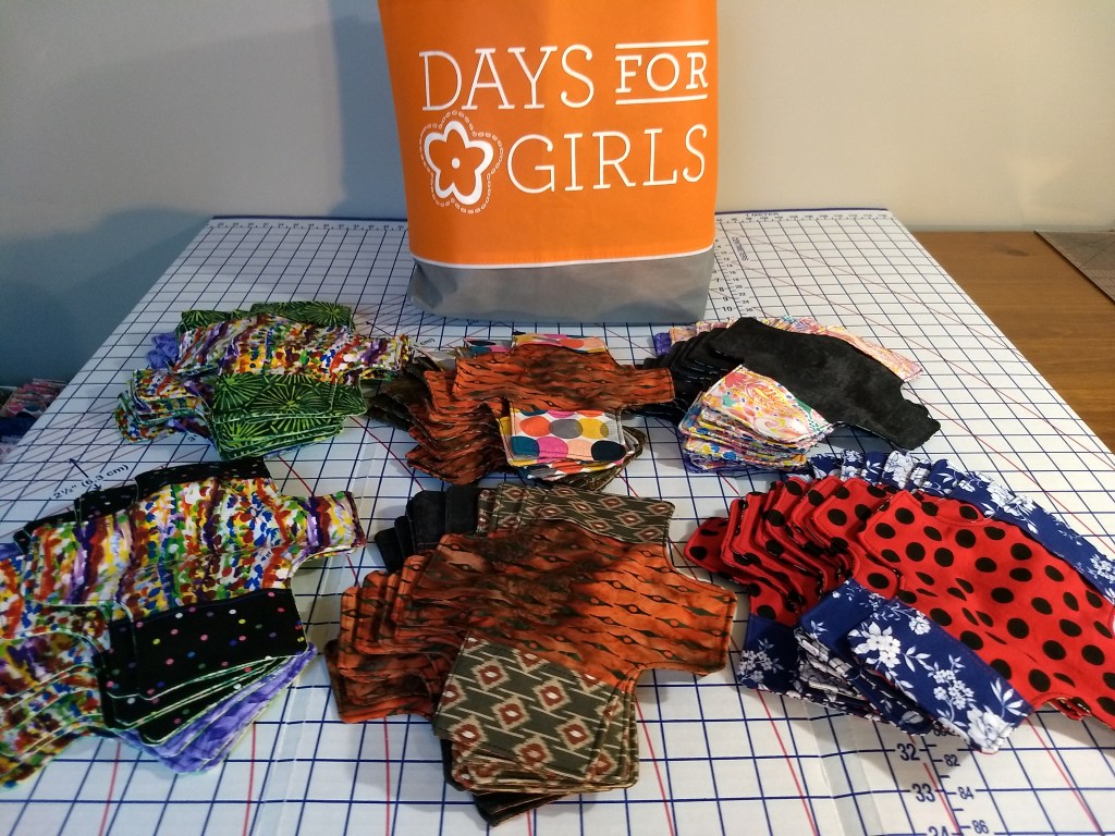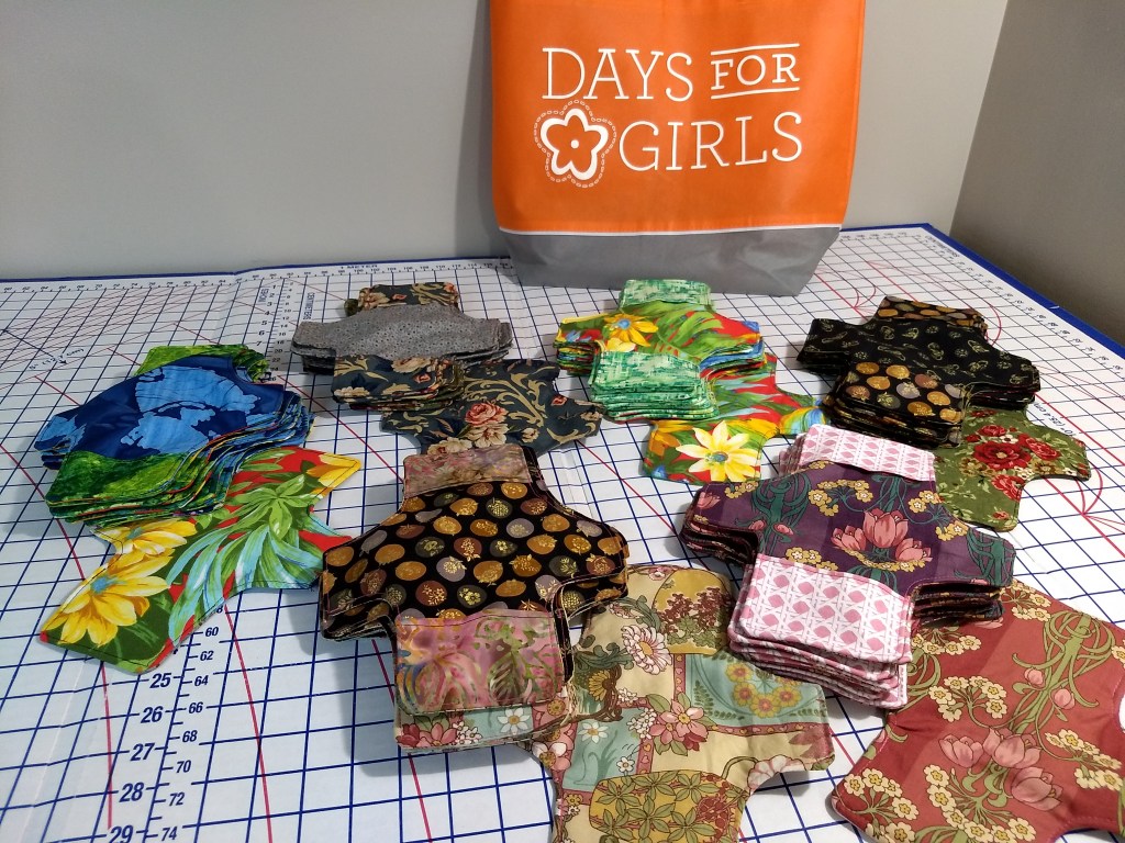 Color/pattern: My strategy for purchasing fabric has been to maximize variation in color and patterns within the Days for Girls guidelines. The goal is to keep it interesting for “me” as well as the recipients of the kits. I photographed three combinations from my latest work…