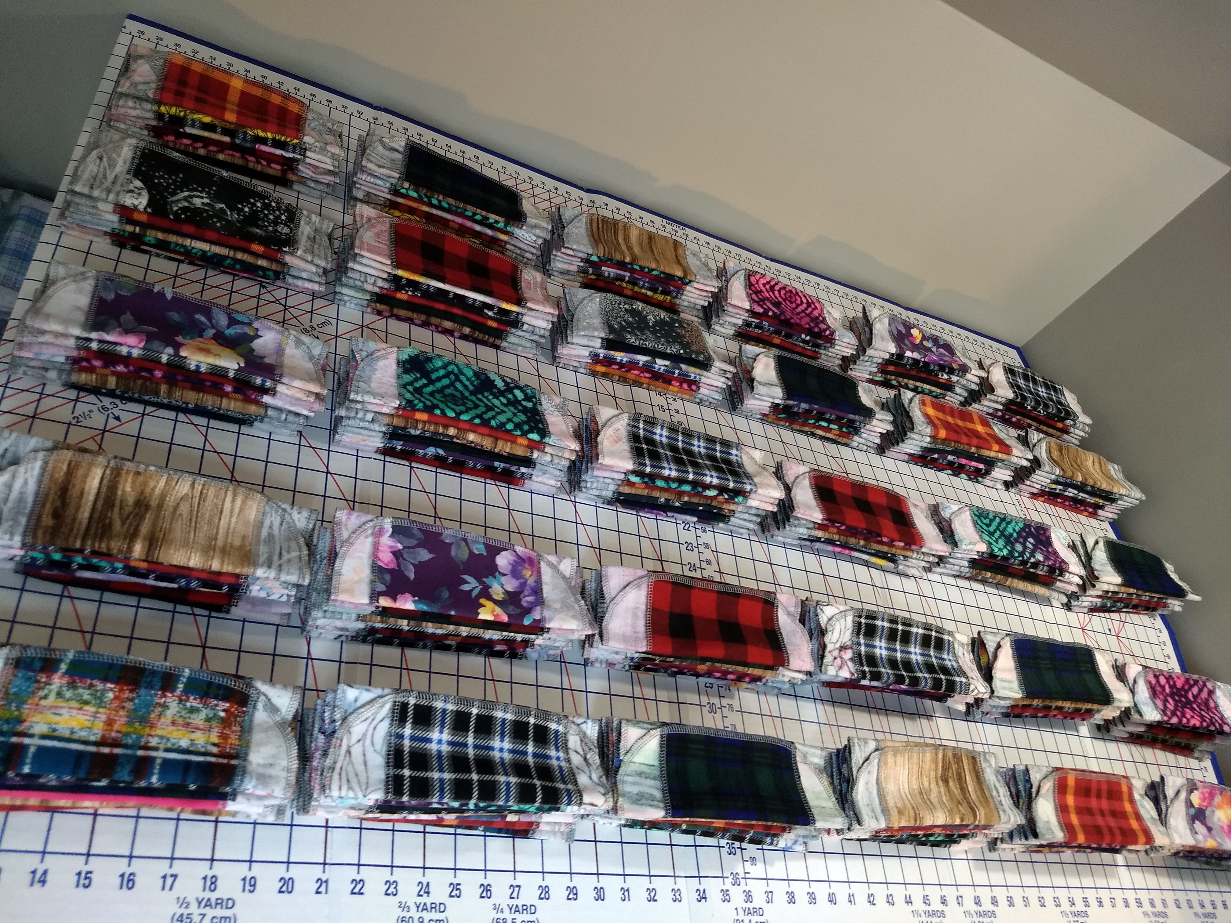 Eight flannel pads per kit. I usually support 30 kits with each lot I sew. This photo shows 30 stacks of 8 tri-fold flannel pads.