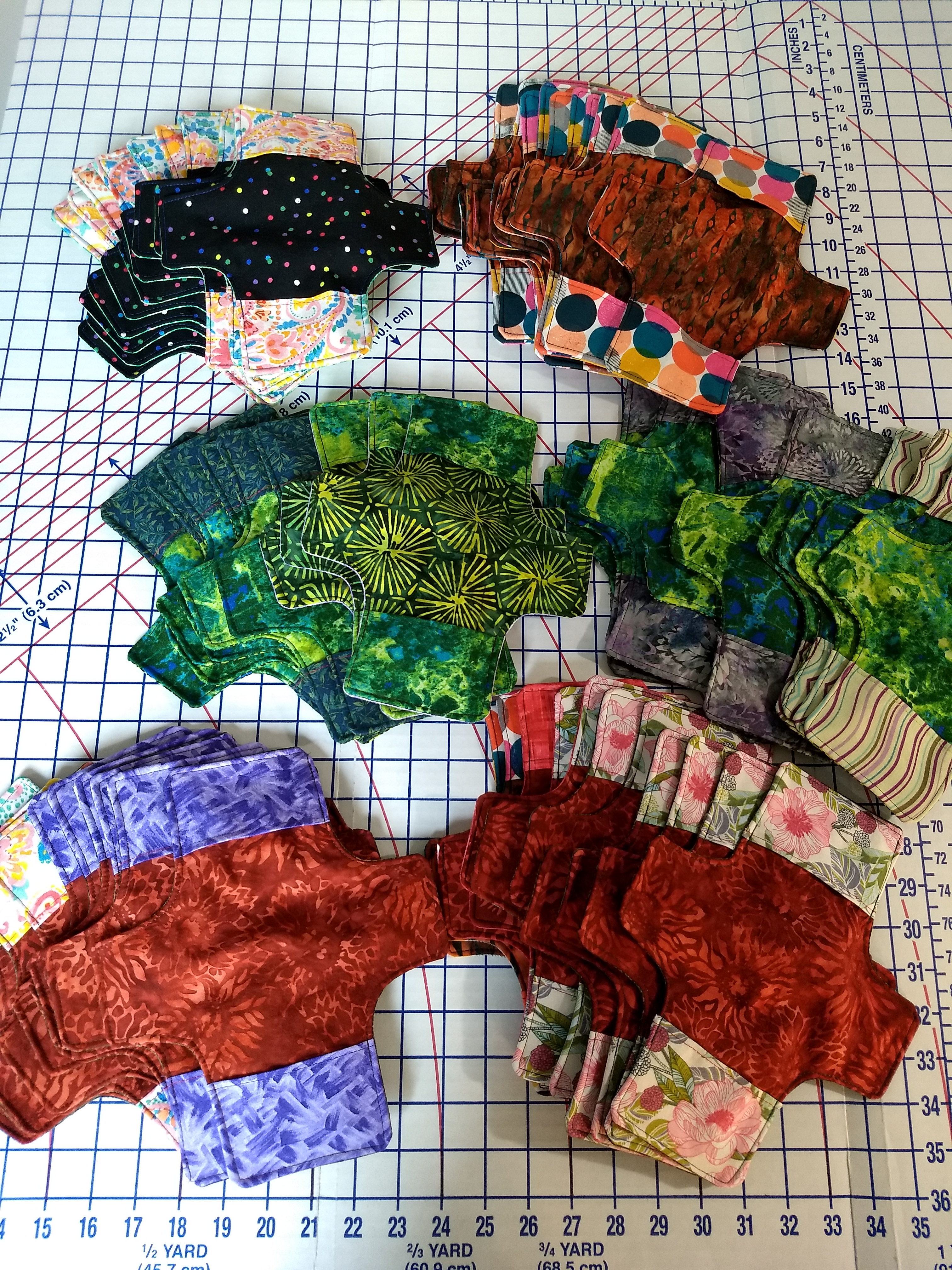 Although I still buy flannel 32 yards at time, 8 different colors/patterns 4 yards each…(this facilitates washing/drying impacting shrinkage)…which I cut into one yard lengths, which makes 10 flannel pads, which is very manageable and are placed in freezer gallon ziplock bags, which makes for easy counting and the ziplock bags are then provided in the finished DfGI kits.