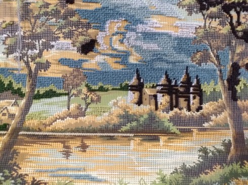 Yes, this canvas was well within my budget for a souvenir from France in 1985.  The merits also included being light weight, easily packed and a remembrance of travels while needlepointing.  The problem is… it is still unfinished in 2017…over 30 years later!