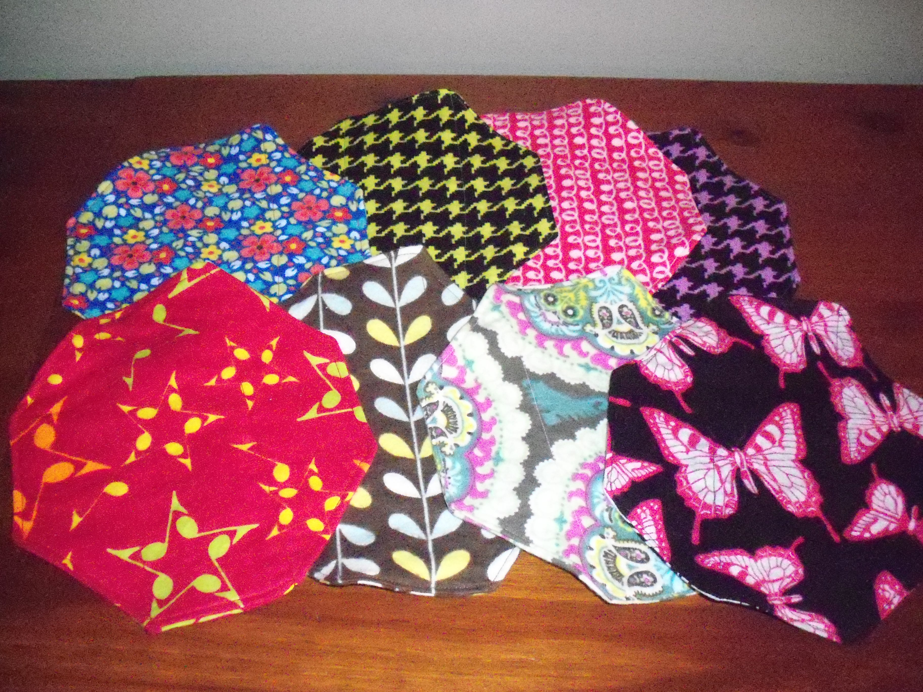 I have volunteered since 2014.  After some months, I chose to concentrate on making the reversible trifold flannel pads and the top stitched shields with pockets, wings and PUL (polyurethane laminate).  (The drawstring bags, seen in most DfGI photos, make the 11th sewn item for each kit.)  Volunteer’s choice!