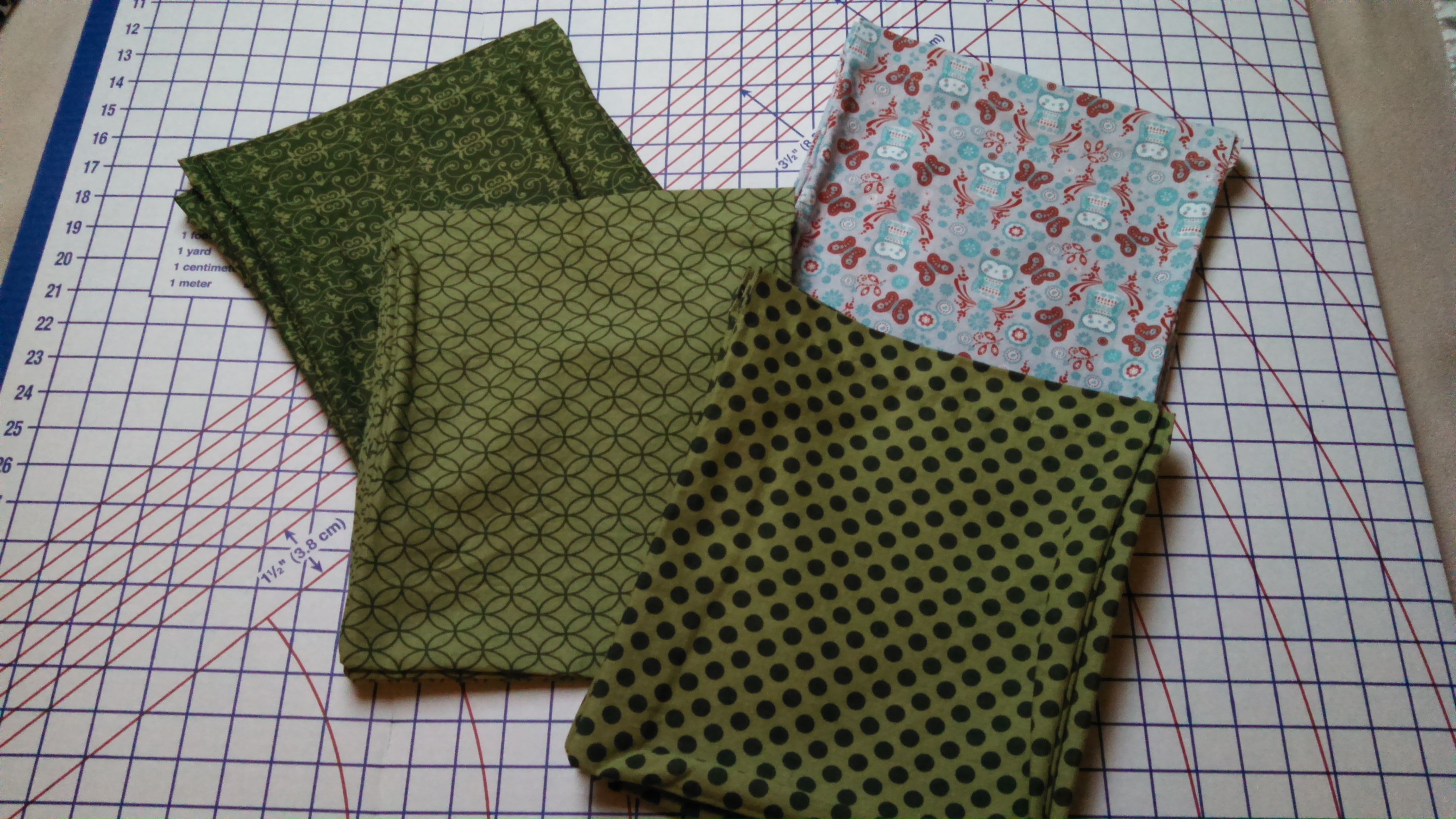 My first shipment includes 22 wash cloths, 22 drawstring bags in 3 different fabrics, 44 liners with wings and 88 pockets and most importantly….176 tri-fold flannel pads in 8 different colors.