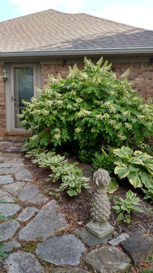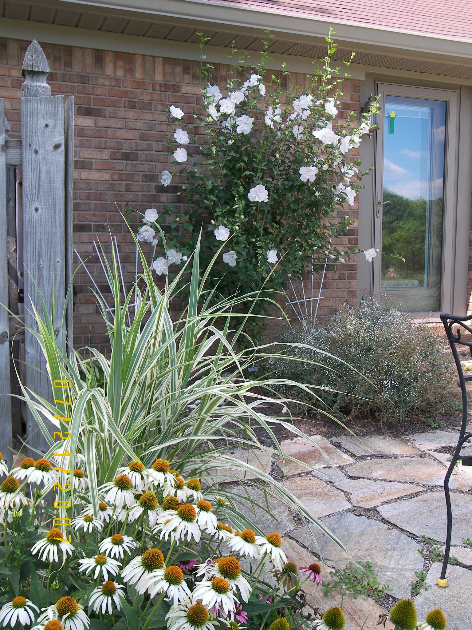 The inspiration for the master bedroom patio garden came to me June 9, 2001, fourteen years ago. Mary Francis wrote “Moonbeams and garden dreams” for the Indianapolis Star. It was my introduction to moon gardens. White flowers, silver and variegated foliage may be subtle by day, however they glow in moonlight as does the golden quartz flagstone.