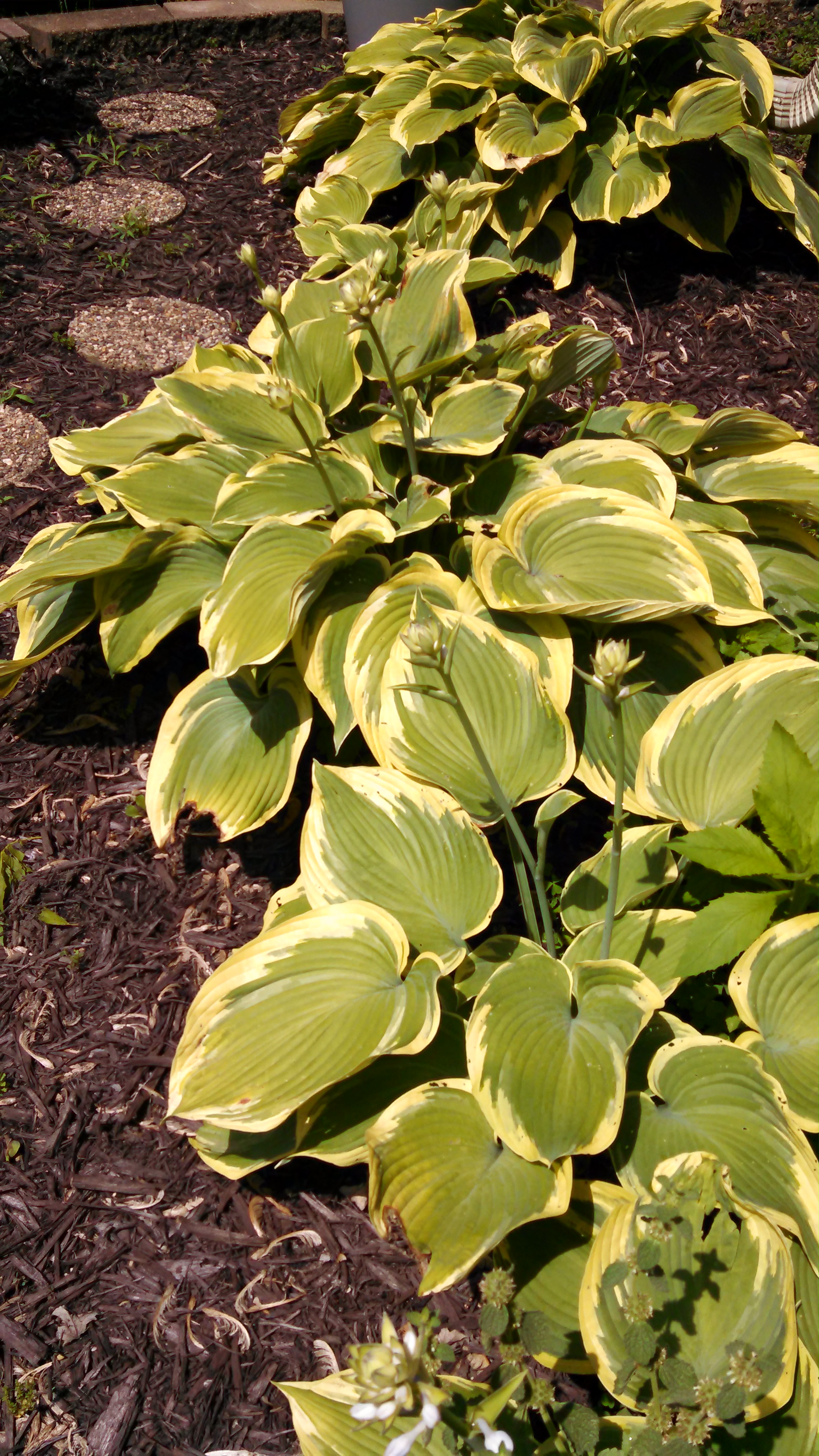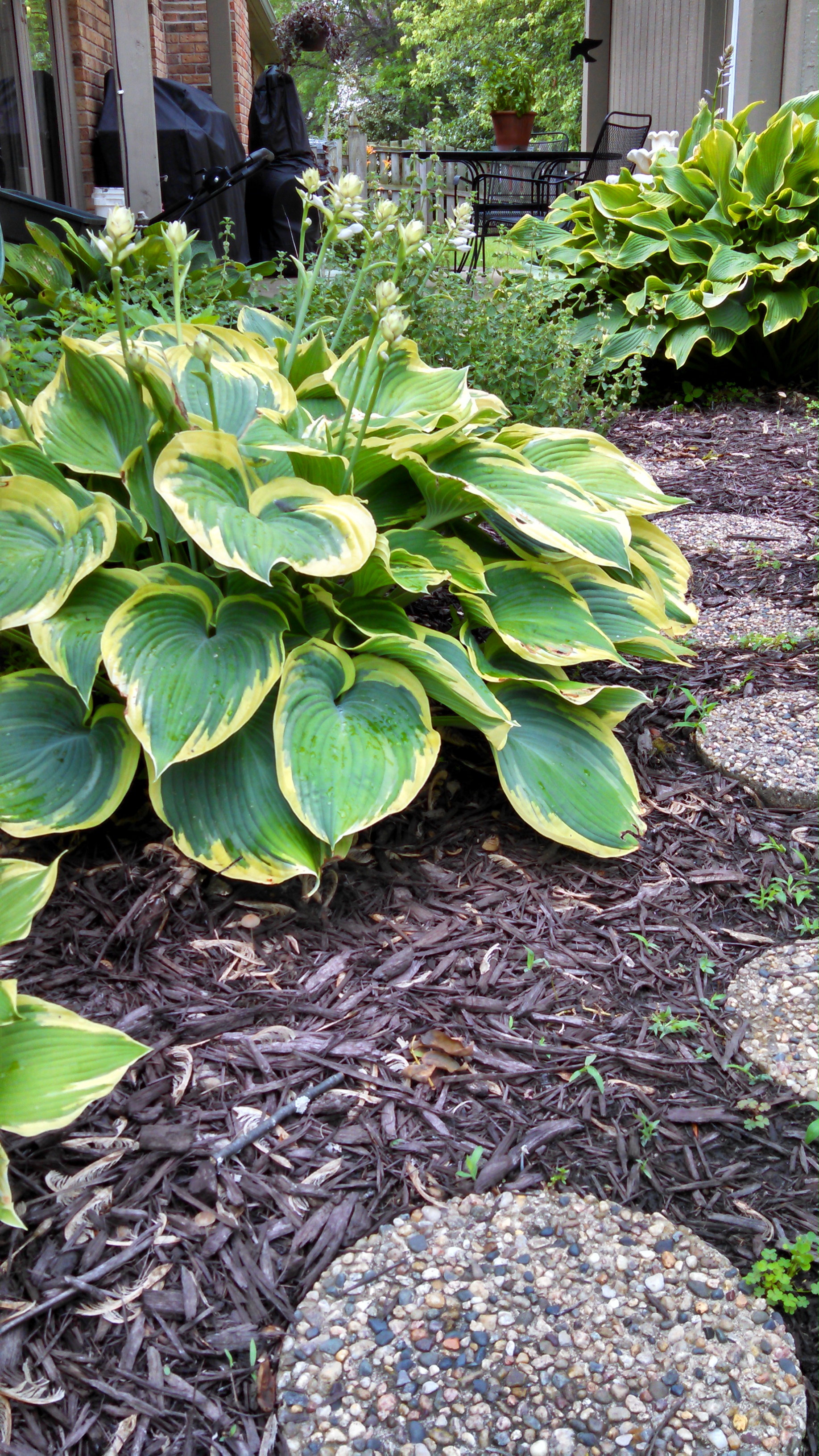 The large dense leaves on hostas block sunlight, which discourages weeds in the plantings…that is a blessing!
