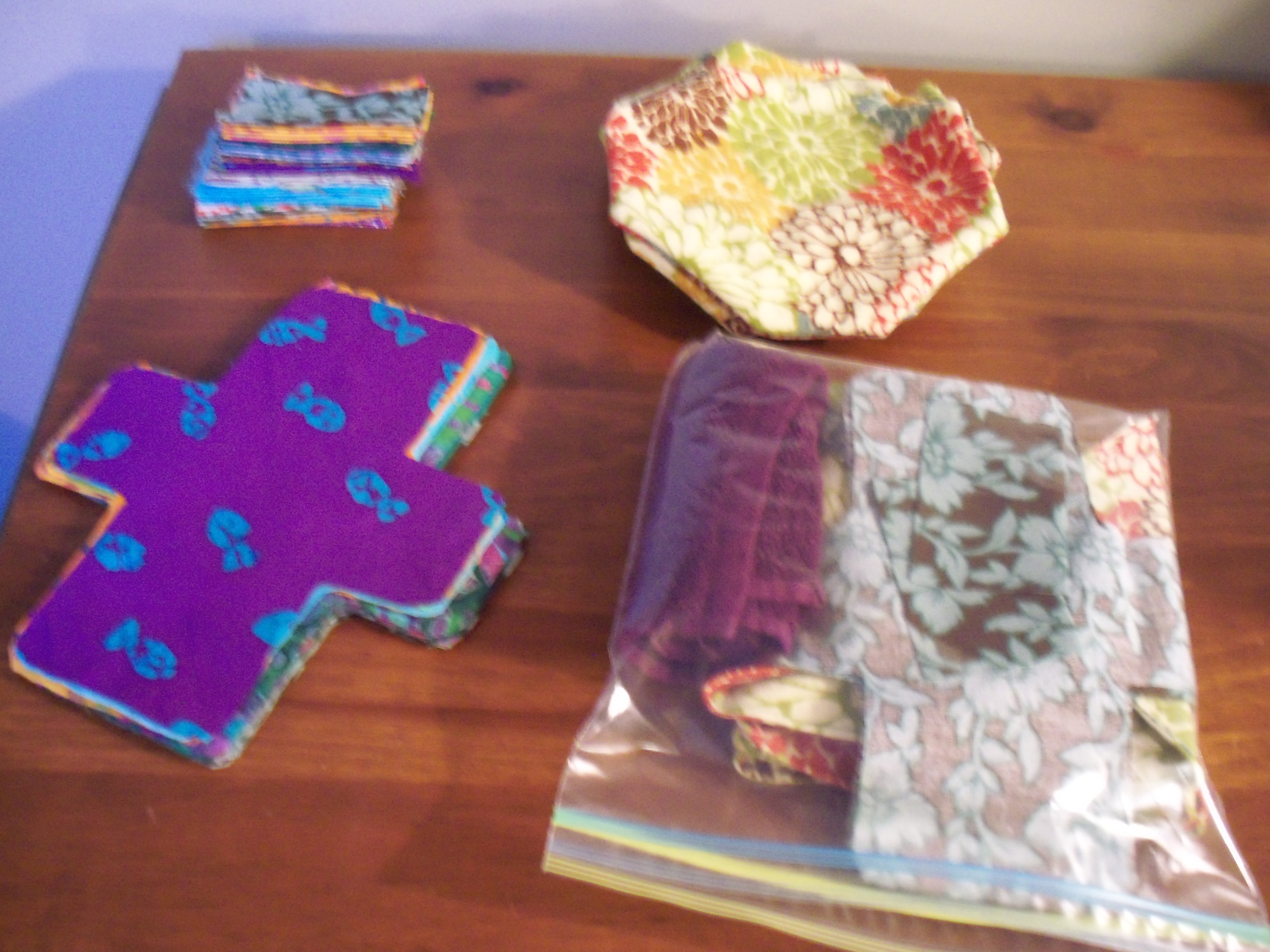 My first shipment includes 22 wash cloths, 22 drawstring bags in 3 different fabrics, 44 liners with wings and 88 pockets and most importantly….176 tri-fold flannel pads in 8 different colors.