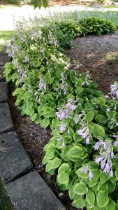 Dilemma? 25 years ago my kitchen garden was two 8’X8′ raised beds in full sun. Over the years the transition has been to nearly full shade. The Earth Angel and Golden Edge Hostas as well as bird bath and feeders were the new look. A sweeping retaining wall replaced the original box plots enclosing about 400 square feet. The dilemma for this season is that we are back to full sun due to the loss of ash trees to disease. The hostas may not survive a hot August. Rather than fine tuning the stepping stone path (and have to redo), I took them up and mulched the path. Check back in the fall on how this season worked out!